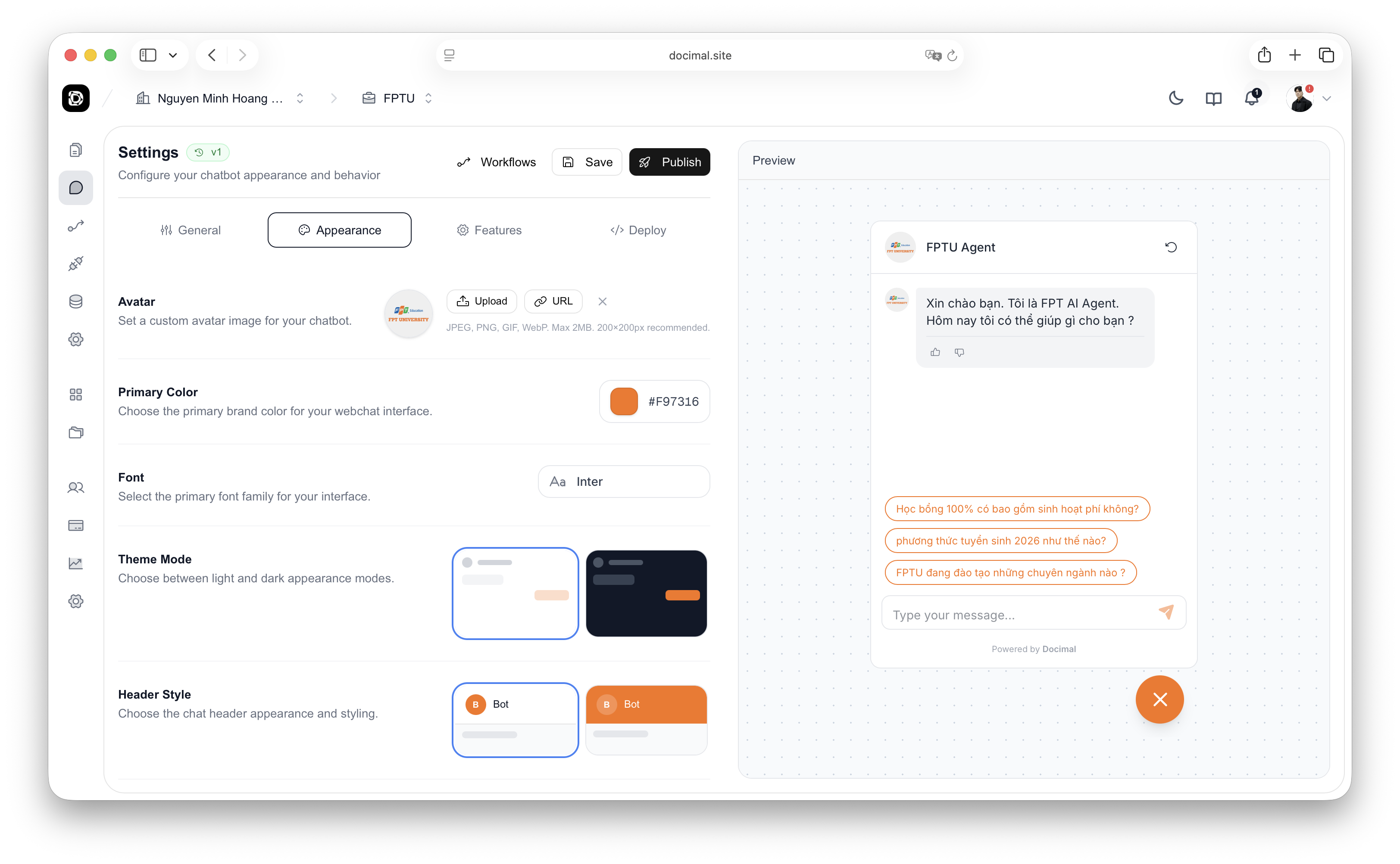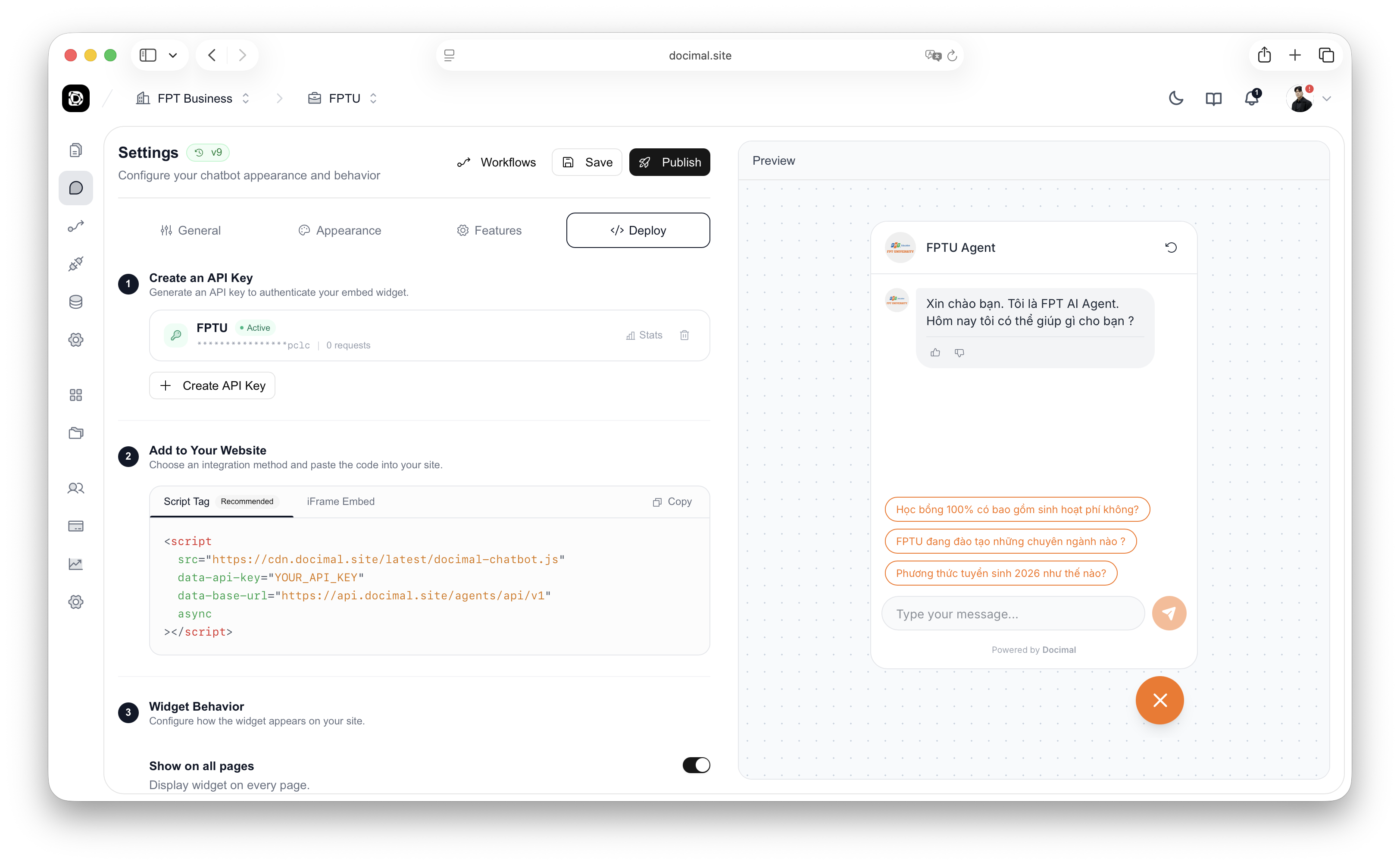 Test your agent and deploy it to your website. Docimal offers multiple deployment options to fit your needs.