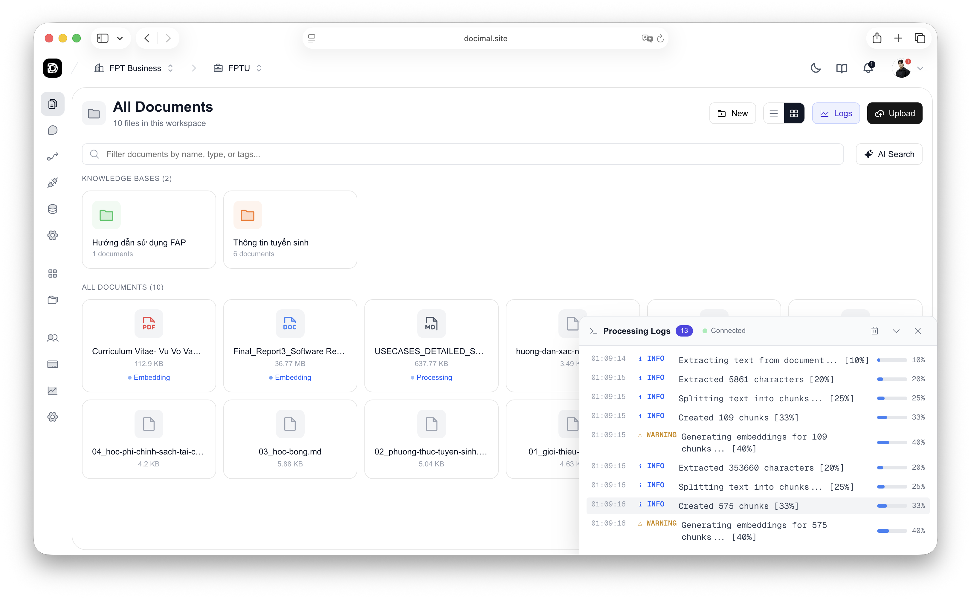 Docimal will chunk, embed, and index your documents. Processing typically takes 10-30 seconds per document. You'll see a checkmark when ready.
