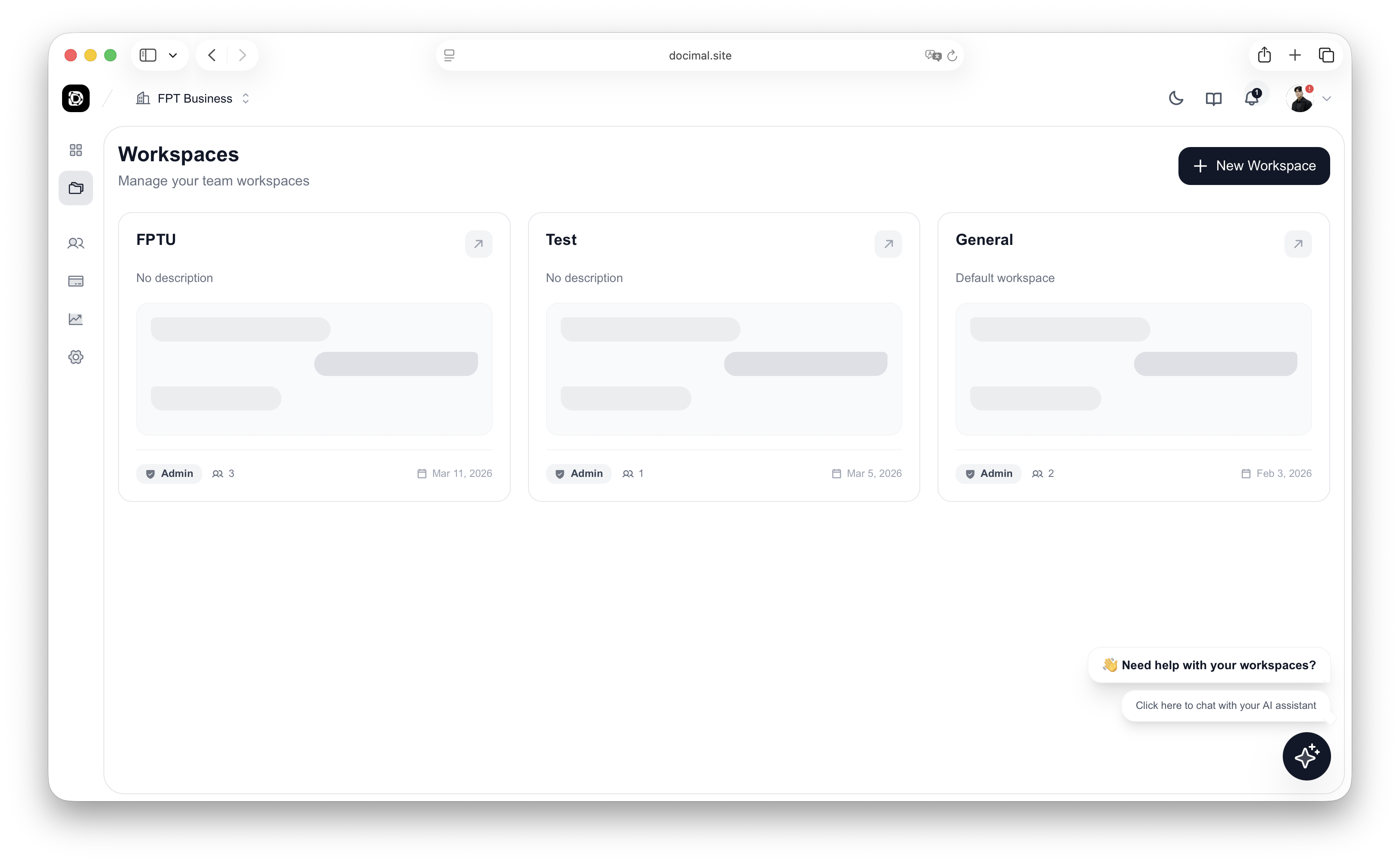 Workspaces are the foundation of Docimal. They organize your projects, documents, AI agents, and team members in one place.